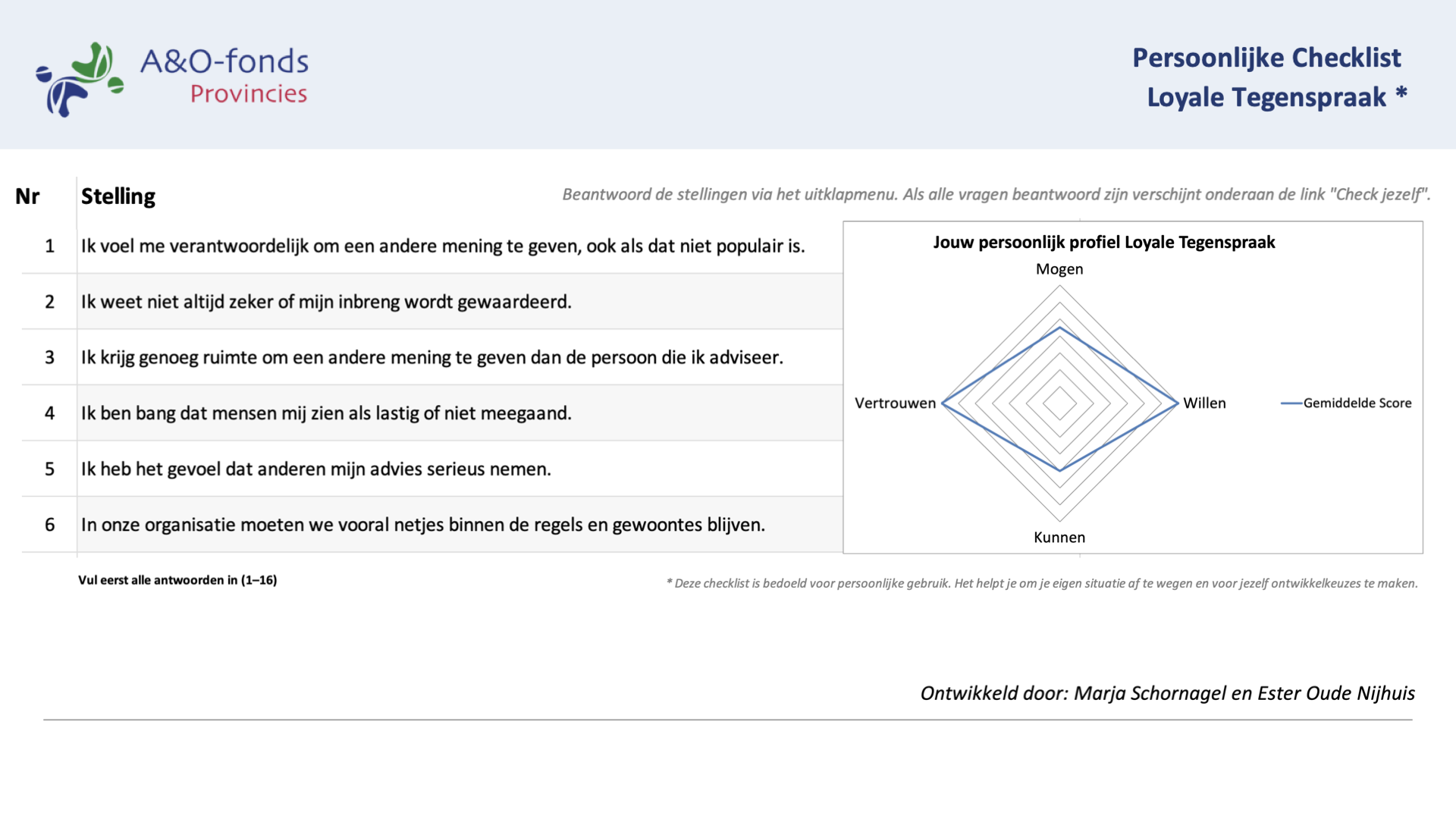 In de checklist vind je 16 stellingen met betrekking tot Kunnen, Willen, Mogen en Vertrouwen, de vier categorieën die nodig zijn voor loyale tegenspraak. Het resultaat geeft inzicht in hoe jij loyale tegenspraak ervaart en gebruikt.