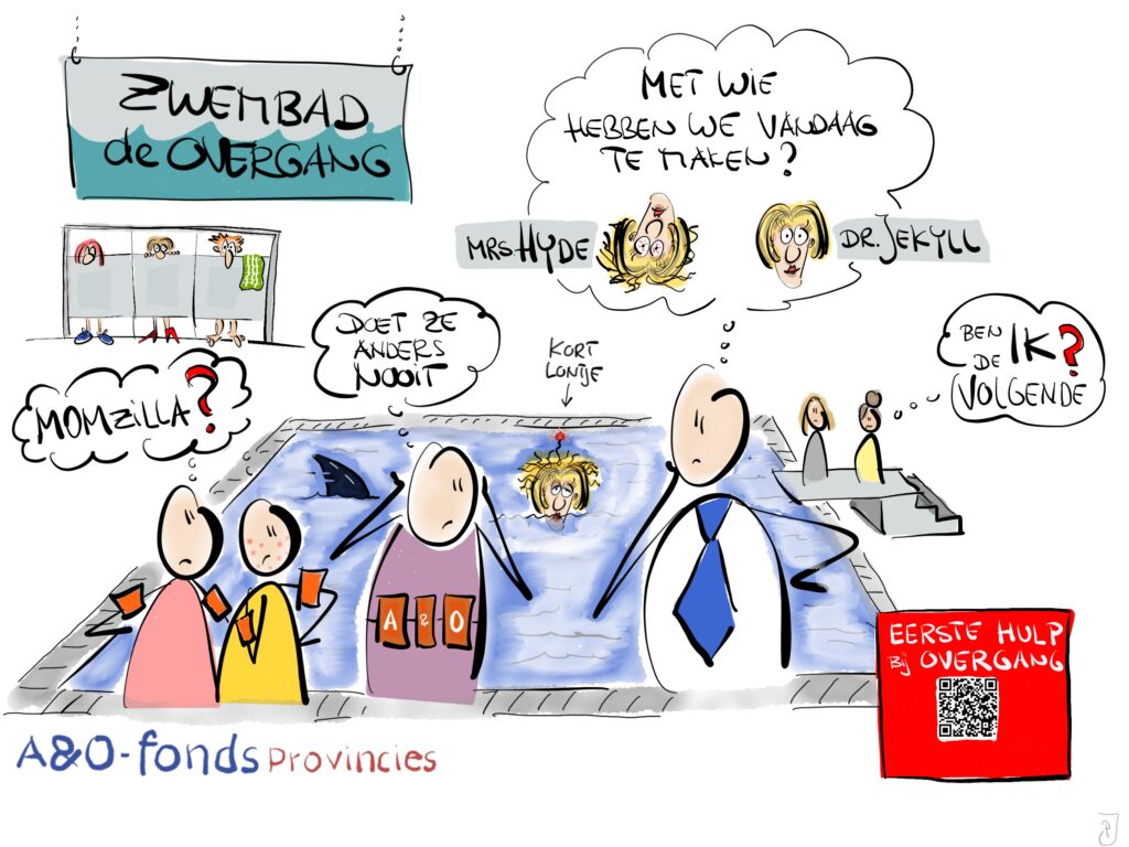 Dezelfde zwembadsetting, nu met nadruk op de omgeving. Aan de rand staan mensen met tekstwolkjes als “Met wie hebben we vandaag te maken – Mrs. Hyde of Dr. Jekyll?”, “Doet ze anders nooit” en “Momzilla?”. In het water ligt dezelfde vrouw met badmuts, zichtbaar gefrustreerd, met de tekst “Kort lontje”. Een man met A&O-letters op zijn borst kijkt bedenkelijk toe, terwijl iemand op de tribune denkt: “Ben ik de volgende?”. Linksboven zijn drie vrouwen in kleedhokjes. Rechts staat een rood kastje met “Eerste Hulp bij Overgang” en een QR-code.
