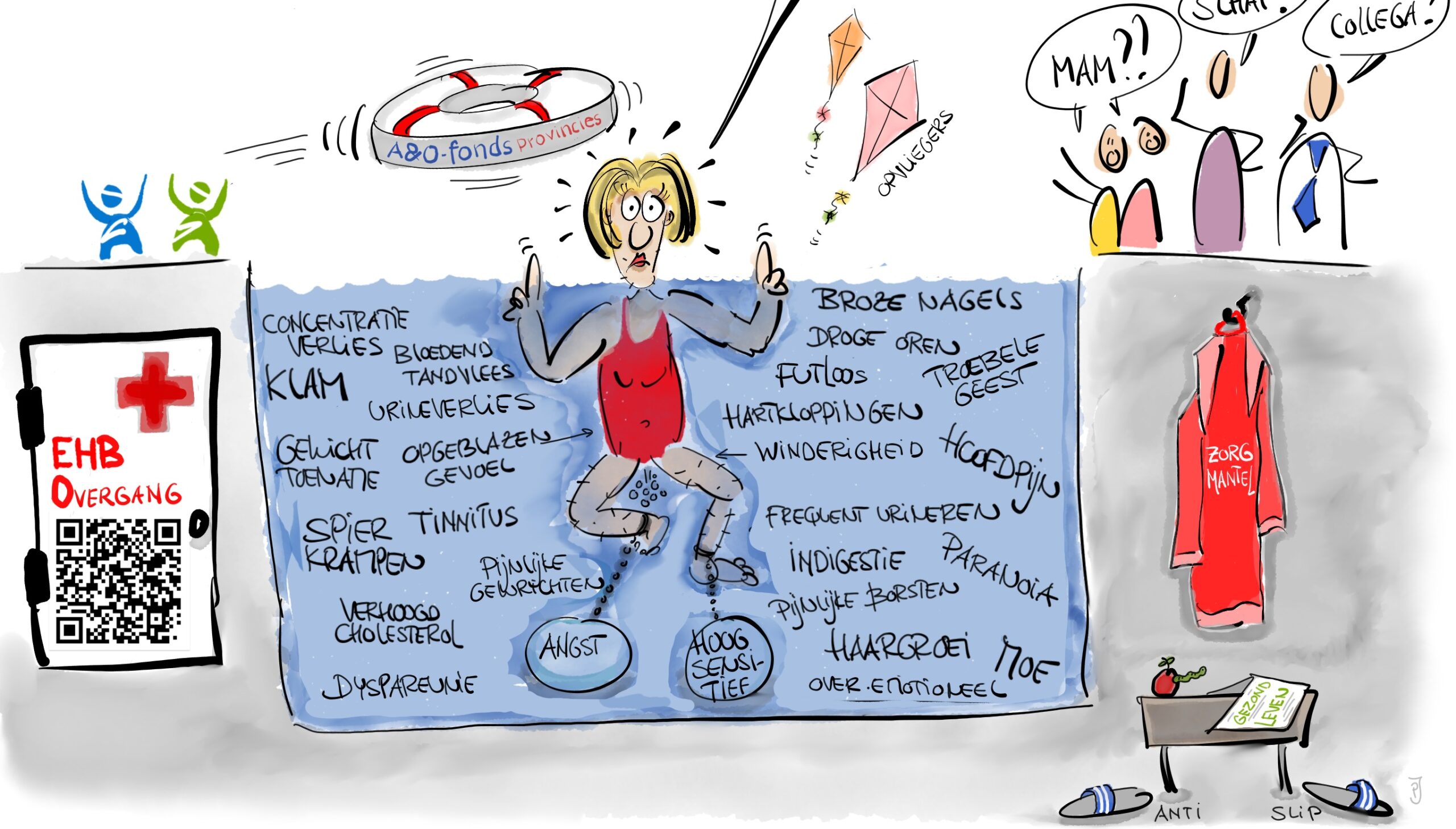 In het midden zit een vrouw in een rood badpak half onder water, omringd door woorden als concentratieverlies, gewichtstoename, angst, hartkloppingen en pijnlijke gewrichten — klachten die op het wateroppervlak staan geschreven. Links staat een koffer met “EHB Overgang” en een QR-code. Rechts hangen een rode badjas met het label “Zorg Mantel”, sloffen en een boek “Gezonde Leefstijl”.